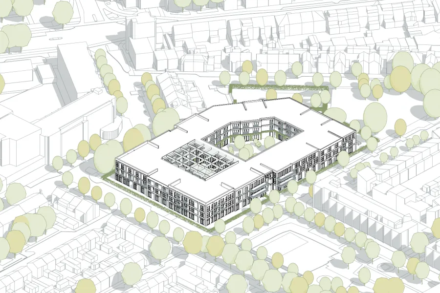 Het eerste ontwerp van het nieuwe Huis ter Wijck laat de contouren zien van hoe het gebouw in de wijk past. ViVa! Zorggroep verwacht na de zomer te kunnen werken aan een definitief ontwerp.