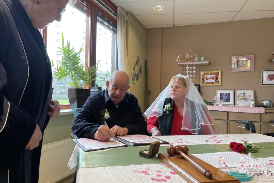 ’She’s always a woman’ van Billy Joël klinkt door het meegebrachte bluetooth-speakertje als de BABS met de twee bloemetjes strooiende bruidsmeisjes, die Jan ook kennen van de dagbesteding, de rode loper afloopt. Nagenoeg alle stoeltjes zijn bezet als het stel met rollator en bruidssluier arriveert. Jan maakt al lopend een babbeltje met de aanwezigen. ,,Leuk dat ik ga trouwen? Ja, inderdaad.” Ook tijdens het praatje van de BABS kunnen de aanwezigen rekenen op wat geintjes van Jan. Als wordt aangehaald dat de bruidegom 50 jaar geleden naar Café Rode Sien kwam om te biljarten, klinkt het: ,,Nee, om te drinken.” En wanneer de BABS benoemt dat het idee voor het hernieuwde huwelijk uit Rieks koker kwam, roept Jan: ,,Ik ben gedwongen.” Als de hele zaal om Jan in een deuk ligt, moet medewerker van de dagbeweging, Jolanda Hendriks van tijd tot tijd herhalen wat er gezegd wordt voor een meneer met een wandelstok op de achterste rij. ,,Altijd lachen met Jan”, klinkt het verderop in de ruimte.